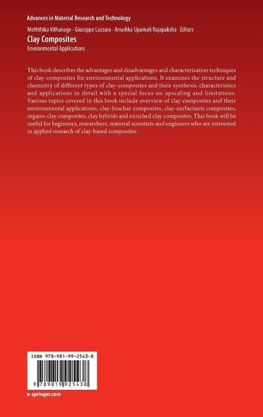 This book describes the advantages and disadvantages and characterization techniques of clay-composites for environmental applications. It examines the structure and chemistry of different types of clay-composites and their synthesis, characteristics and applications in detail with a special focus on upscaling and limitations. Various topics covered in this book include overview of clay composites and their environmental applications, clay-biochar composites, clay-surfactants composites, organo-clay composites, clay hybrids and enriched clay composites. This book will be useful for beginners, researchers, material scientists and engineers who are interested in applied research of clay-based composites.