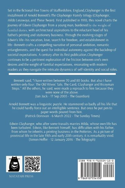 Set in the fictional Five Towns of Staffordshire, England, Clayhanger is the first installment of Arnold Bennett's Clayhanger Family trilogy (Clayhanger, Hilda Lessways, and These Twain). First published in 1910, this novel charts the journey of Edwin Clayhanger from a young man, burdened by the weight of familial duties, with architectural aspirations to the reluctant head of his father's printing and stationery business. Through the evolving stages of Edwin's life-his vocation, love, search for freedom, and establishment in life-Bennett crafts a compelling narrative of personal ambition, romantic entanglements, and the quest for individual autonomy against the backdrop of societal expectations. A century after its first publication, Clayhanger continues to be a pertinent exploration of the friction between one's own desires and the weight of familial expectations, resonating with modern readers as they navigate the intricate dynamics of self-identity and social roles.
