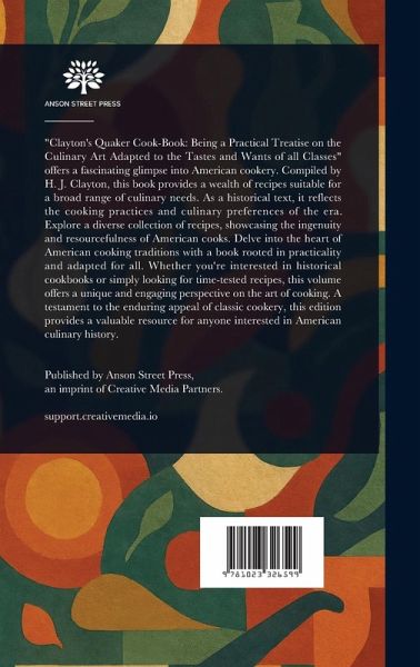 "Clayton's Quaker Cook-Book: Being a Practical Treatise on the Culinary Art Adapted to the Tastes and Wants of all Classes" offers a fascinating glimpse into American cookery. Compiled by H. J. Clayton, this book provides a wealth of recipes suitable for a broad range of culinary needs. As a historical text, it reflects the cooking practices and culinary preferences of the era. Explore a diverse collection of recipes, showcasing the ingenuity and resourcefulness of American cooks. Delve into the heart of American cooking traditions with a book rooted in practicality and adapted for all. Whether you're interested in historical cookbooks or simply looking for time-tested recipes, this volume offers a unique and engaging perspective on the art of cooking. A testament to the enduring appeal of classic cookery, this edition provides a valuable resource for anyone interested in American culinary history. This work has been selected by scholars as being culturally important, and is part of the knowledge base of civilization as we know it. This work is in the public domain in the United States of America, and possibly other nations. Within the United States, you may freely copy and distribute this work, as no entity (individual or corporate) has a copyright on the body of the work. Scholars believe, and we concur, that this work is important enough to be preserved, reproduced, and made generally available to the public. We appreciate your support of the preservation process, and thank you for being an important part of keeping this knowledge alive and relevant.