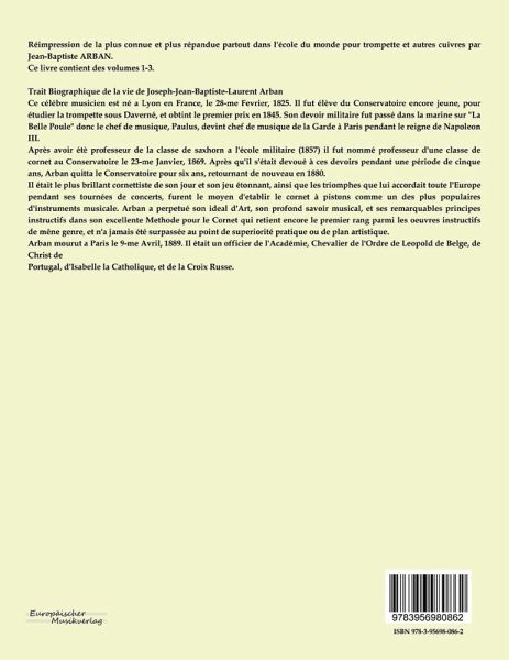 Réimpression de la plus connue et plus répandue partout dans l\'école du monde pour trompette et autres cuivres par Jean-Baptiste ARBAN. Ce livre contient des volumes 1-3. Trait Biographique de la vie de Joseph-Jean-Baptiste-Laurent Arban Ce célébre musicien est né a Lyon en France, le 28-me Fevrier, 1825. Il fut élève du Conservatoire encore jeune, pour étudier la trompette sous Daverné, et obtint le premier prix en 1845. Son devoir militaire fut passé dans la marine sur \"La Belle Poule\" donc le chef de musique, Paulus, devint chef de musique de la Garde à Paris pendant le reigne de Napoleon III. Après avoir étè professeur de la classe de saxhorn a l\'école militaire (1857) il fut nommé professeur d\'une classe de cornet au Conservatoire le 23-me Janvier, 1869. Après qu\'il s\'était devoué à ces devoirs pendant une période de cinque ans, Arban quitta le Conservatoire pour six ans, retournant de nouveau en 1880. Il était le plus brillant cornettiste de son jour et son jeu étonnant, ainsi que les triomphes que lui accordait toute l\'Europe pendant ses tournées de concerts, furent le moyen d\'etablir le cornet à pistons comme un des plus populaires d\'instruments musicale. Arban a perpetué son ideal d\'Art, son profond savoir musical, et ses remarquables principes instructifs dans son excellente Methode pour le Cornet qui retient encore le premier rang parmi les oeuvres instructifs de mêne genre, et n\'a jamais été surpassée au point de superiorité pratique ou de plan artistique. Arban mourut a Paris le 9-me Avril, 1889. Il était un officier de l\'Académie, Chevalier de l\'Ordre de Leopold de Belge, de Christ de Portugal, d\'Isabelle la Catholique, et de la Croix Russe.