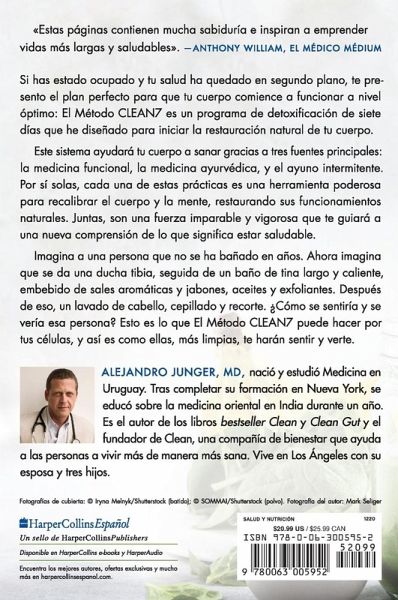 «Estas páginas contienen mucha sabiduría e inspiran a emprender vidas más largas y saludables». ?Anthony William, el Médico Médium Si has estado ocupado y tu salud ha quedado en segundo plano, te presento el plan perfecto para que tu cuerpo comience a funcionar a nivel óptimo: El Método Clean 7 es un programa de detoxificación de siete días que he diseñado para iniciar la restauración natural de tu cuerpo. Este sistema ayudará tu cuerpo a sanar gracias a tres fuentes principales: la medicina funcional, la medicina ayurvédica, y el ayuno intermitente. Por sí solas, cada una de estas prácticas es una herramienta poderosa para recalibrar el cuerpo y la mente, restaurando sus funcionamientos naturales. Juntas, son una fuerza imparable y vigorosa que te guiará a una nueva comprensión de lo que significa estar saludable. Imagina a una persona que no se ha bañado en años. Ahora imagina que se da una ducha tibia, seguida de un baño de tina largo y caliente, embebido de sales aromáticas y jabones, aceites y exfoliantes. Después de eso, un lavado de cabello, cepillado y recorte. ¿Cómo se sentiría y se vería esa persona? Esto es lo que El Método Clean 7 puede hacer por tus células, y así es como ellas, más limpias, te harán sentir, y verte. ALEJANDRO JUNGER, M.D. nació y estudió Medicina en Uruguay. Tras completar su formación en Nueva York, se educó sobre la medicina oriental en India durante un año. Es el autor de los libros bestseller Clean y Clean Gut y el fundador de Clean, una compañía de bienestar que ayuda a las personas a vivir más de manera más sana. Vive en Los Ángeles con su esposa y tres hijos.