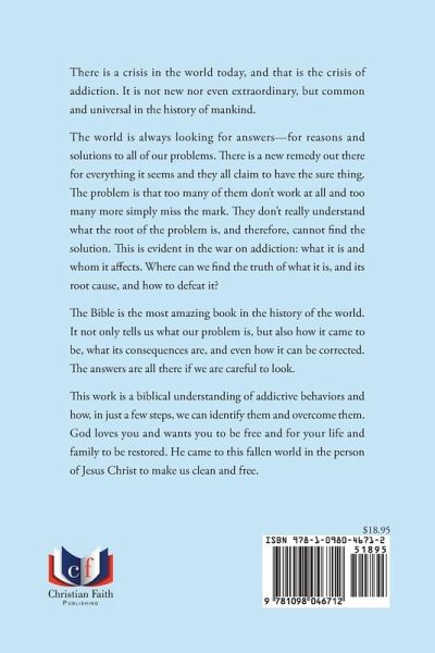 There is a crisis in the world today, and that is the crisis of addiction. It is not new nor even extraordinary, but common and universal in the history of mankind. The world is always looking for answers—for reasons and solutions to all of our problems. There is a new remedy out there for everything it seems and they all claim to have the sure thing. The problem is that too many of them don't work at all and too many more simply miss the mark. They don't really understand what the root of the problem is, and therefore, cannot find the solution. This is evident in the war on addiction: what it is and whom it affects. Where can we find the truth of what it is, and its root cause, and how to defeat it? The Bible is the most amazing book in the history of the world. It not only tells us what our problem is, but also how it came to be, what its consequences are, and even how it can be corrected. The answers are all there if we are careful to look. This work is a biblical understanding of addictive behaviors and how, in just a few steps, we can identify them and overcome them. God loves you and wants you to be free and for your life and family to be restored. He came to this fallen world in the person of Jesus Christ to make us clean and free.