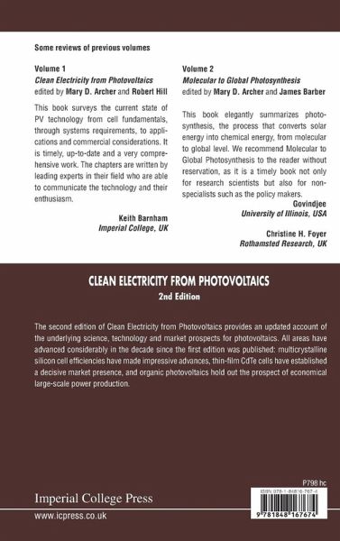 The second edition of Clean Electricity from Photovoltaics, first published in 2001, provides an updated account of the underlying science, technology and market prospects for photovoltaics. All areas have advanced considerably in the decade since the first edition was published, which include: multi-crystalline silicon cell efficiencies having made impressive advances, thin-film CdTe cells having established a decisive market presence, and organic photovoltaics holding out the prospect of economical large-scale power production.