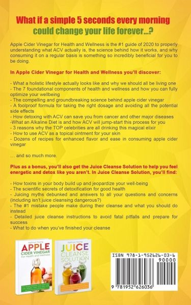 What if a simple 5 seconds every morning could change your life forever...? Apple Cider Vinegar for Health and Wellness is the #1 guide of 2020 to properly understanding what ACV actually is, the science behind how it works, and why consuming it on a regular basis is something so incredibly beneficial for you to be doing. In Apple Cider Vinegar for Health and Wellness you'll discover: * What a holistic lifestyle actually looks like and why we should all be living one * The 7 foundational components of health and wellness and how you can fully optimize your wellbeing * The compelling and groundbreaking science behind apple cider vinegar * A foolproof formula for taking the right dosage and avoiding all the potential side effects * How detoxing with ACV can save you from cancer and other major diseases * What an Alkaline Diet is and how ACV will jump-start this process for you * 3 reasons why the TOP celebrities are all drinking this magical elixir * How to use ACV as a topical ointment for your skin * Dozens of recipes for enhanced flavor and ease in consuming apple cider vinegar ... and so much more. Plus as a bonus, you'll also get the Juice Cleanse Solution to help you feel energetic and detox like you aren't. In Juice Cleanse Solution, you'll find: * How toxins in your body build up and jeopardize your well-being * The scientific secrets of detoxification for good health * Juicing myths debunked and answers to all your questions and concerns (including isn't juice cleansing dangerous?) * The #1 mistake people make during their cleanse and what you should do instead * Detailed juice cleanse instructions to avoid fatal pitfalls and prepare for success * What to do when you've finished your cleanse