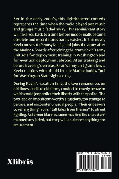 Set in the early 2000's, this lighthearted comedy represents the time when the radio played pop music and grunge music faded away. This reminiscent story will take you back to a time before indoor malls became obsolete and record stores barely existed. In this novel, Kevin moves to Pennsylvania, and joins the army after the Marines. Shortly after joining the army, Kevin's army unit sets for deployment training in Washington and for eventual deployment abroad. After training and before traveling overseas, Kevin's army unit grants leave. Kevin reunites with his old female Marine buddy, Toni for Washington State sightseeing. During Kevin's vacation time, the two remanences on old times, and like old times, conduct in rowdy behavior which could jeopardize their liberty with the police. The two lead on into sitcom-worthy situations, too strange to be true, and encounter unusual people. Their endeavors cover anything from, "tall tales from the sea" to street fighting. As former Marines, some may find the characters' mannerisms jaded, but they will do almost anything for amusement.