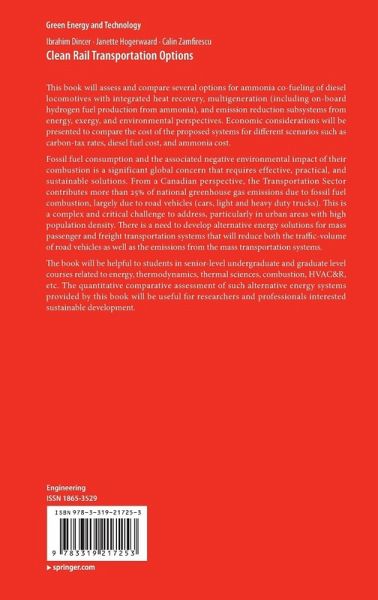 Fossil fuel consumption and the associated negative environmental impact of their combustion is a significant global concern that requires effective, practical, and sustainable solutions. From a Canadian perspective, the Transportation Sector contributes more than 25% of national greenhouse gas emissions due to fossil fuel combustion, largely due to road vehicles (cars, light and heavy duty trucks). This is a complex and critical challenge to address, particularly in urban areas with high population density. There is a need to develop alternative energy solutions for mass passenger and freight transportation systems that will reduce both the traffic-volume of road vehicles as well as the emissions from the mass transportation systems. The book will be helpful to students in senior-level undergraduate and graduate level courses related to energy, thermodynamics, thermal sciences, combustion, HVAC&R, etc. The quantitative comparative assessment of such alternative energy systems provided by this book will be useful for researchers and professionals interested sustainable development.