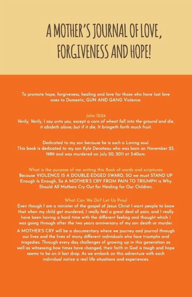 Cleansing Your Heart, a mother's journal of love, forgiveness, and hope! VIOLENCE IS A DOUBLE-EDGED SWORD As a mother of a son who was murdered, my cry extends beyond myself. I realize that the double-edged sword of violence affects the mother of the murderer as well. Both mothers suffer, whether their loss is from death or prison. I believe that now is the time to unite as mothers and pray for our children, especially the young who may fall prey to the life of the streets.