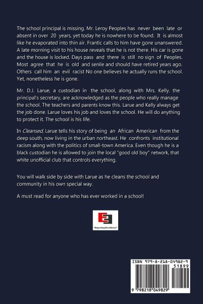 The school principal is missing. Mr. Leroy Peoples has never been late or absent in over 20 years, yet today he is nowhere to be found. It is almost like he evaporated into thin air. Frantic calls to him have gone unanswered. A late morning visit to his house reveals that he is not there. His car is gone and the house is locked. Days pass and there is still no sign of Peoples. Most agree that he is old and senile and should have retired years ago. Others call him an evil racist. No one believes he actually runs the school. Yet, nonetheless his is gone. Mr. D.J. Larue, a custodian in the school, along with Mrs. Kelly, the principal's secretary, are acknowledged as the people who really manage the school. The teachers and parents know this. Larue and Kelly always get the job done. Larue loves his job and loves the school. He will do anything to protect it. The school is his life. In Cleansed, Larue tells his story of being an African American from the deep south, now living in urban northeast. He confronts institutional racism along with the politics of small-town America. Even though he is a black custodian he is allowed to join the local "good old boy" network, that white unofficial club that controls everything. You will walk side by side with Larue as he cleans the school and community in his own special way. A must read for anyone who ever worked in a school!