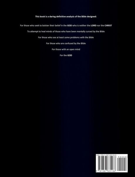 This book seeks to show some of the harm of the Bible. It is meant to assist those who have been mentally harmed by reading the Bible. Some of the harm this book evaluates pertains to the Biblical tree of knowledge of good and evil. Some of the harm this book evaluates pertains to the different entities who are referred to as "God" through the Bible. This version of this book contains White text with a Black background.