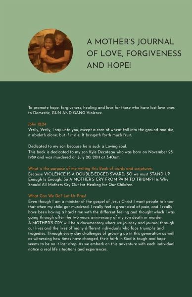 Cleansing Your Heart, a mother's journal of love, forgiveness, and hope! VIOLENCE IS A DOUBLE-EDGED SWORD As a mother of a son who was murdered, my cry extends beyond myself. I realize that the double-edged sword of violence affects the mother of the murderer as well. Both mothers suffer, whether their loss is from death or prison. I believe that now is the time to unite as mothers and pray for our children, especially the young who may fall prey to the life of the streets.