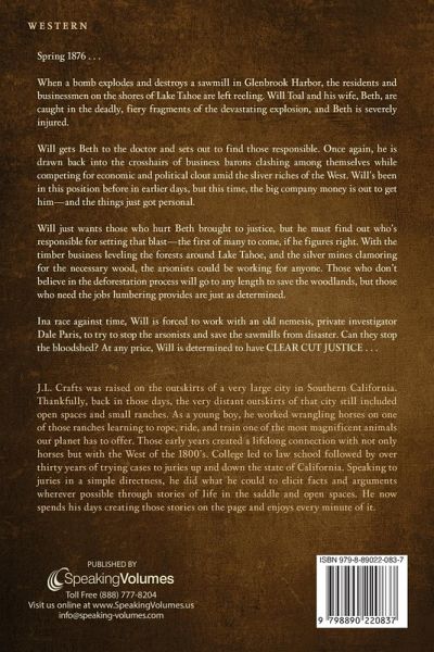 Spring 1876 . . . . When a bomb explodes and destroys a sawmill in Glenbrook Harbor, the residents and businessmen on the shores of Lake Tahoe are left reeling. Will Toal and his wife, Beth, are caught in the deadly, fiery fragments of the devastating explosion, and Beth is severely injured. Will gets Beth to the doctor and sets out to find those responsible. Once again, he is drawn back into the crosshairs of business barons clashing among themselves while competing for economic and political clout amid the sliver riches of the West. Will's been in this position before in earlier days, but this time, the big company money is out to get him-and the things just got personal. Will just wants those who hurt Beth brought to justice, but he must find out who's responsible for setting that blast-the first of many to come, if he figures right. With the timber business leveling the forests around Lake Tahoe, and the silver mines clamoring for the necessary wood, the arsonists could be working for anyone. Those who don't believe in the deforestation process will go to any length to save the woodlands, but those who need the jobs lumbering provides are just as determined. Ina race against time, Will is forced to work with an old nemesis, private investigator Dale Paris, to try to stop the arsonists and save the sawmills from disaster. Can they stop the bloodshed? At any price, Will is determined to have CLEAR CUT JUSTICE . . . .