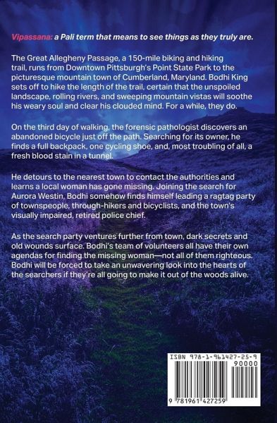 Vipassana: a Pali term that means to see things as they truly are. The Great Allegheny Passage, a 150-mile biking and hiking trail, runs from Downtown Pittsburgh's Point State Park to the picturesque mountain town of Cumberland, Maryland. Bodhi King sets off to hike the length of the trail, certain that the unspoiled landscape, rolling rivers, and sweeping mountain vistas will soothe his weary soul and clear his clouded mind. For a while, they do. On the third day of walking, the forensic pathologist discovers an abandoned bicycle just off the path. Searching for its owner, he finds a full backpack, one cycling shoe, and, most troubling of all, a fresh blood stain in a tunnel. He detours to the nearest town to contact the authorities and learns a local woman has gone missing. Joining the search for Aurora Westin, Bodhi somehow finds himself leading a ragtag party of townspeople, through-hikers and bicyclists, and the town's visually impaired, retired police chief. As the search party ventures further from town, dark secrets and old wounds surface. Bodhi's team of volunteers all have their own agendas for finding the missing woman-not all of them righteous. Bodhi will be forced to take an unwavering look into the hearts of the searchers if they're all going to make it out of the woods alive.