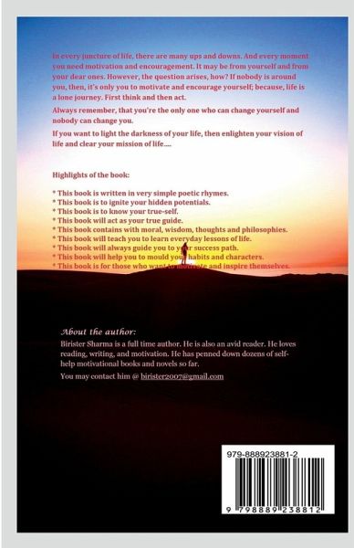 In every juncture of life, there are many ups and downs. And every moment you need motivation and encouragement. It may be from yourself and from your dear ones. However, the question arises, how? If nobody is around you, then, it's only you to motivate and encourage yourself; because, life is a lone journey. First think and then act. Always remember, that you're the only one who can change yourself and nobody can change you. If you want to light the darkness of your life, then enlighten your vision of life and clear your mission of life.... Highlights of the book: * This book is written in very simple poetic rhymes. * This book is to ignite your hidden potentials. * This book is to know your true-self. * This book will act as your true guide. * This book contains with moral, wisdom, thoughts and philosophies. * This book will teach you to learn everyday lessons of life. * This book will always guide you to your success path. * This book will help you to mould your habits and characters. * This book is for those who want to motivate and inspire themselves.