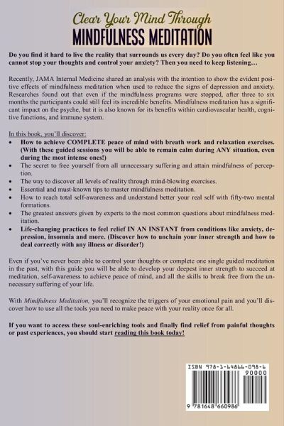 Do you find it hard to live the reality that surrounds us every day? Do you often feel like you cannot stop your thoughts and control your anxiety? Then you need to keep listening... Recently, JAMA Internal Medicine shared an analysis with the intention to show the evident positive effects of mindfulness meditation when used to reduce the signs of depression and anxiety. Researches found out that even if the mindfulness programs were stopped, after three to six months the participants could still feel its incredible benefits. Mindfulness meditation has a significant impact on the psyche, but it is also known for its benefits within cardiovascular health, cognitive functions, and immune system. In this book, you'll discover:How to achieve COMPLETE peace of mind with breath work and relaxation exercises. (With these guided sessions you will be able to remain calm during ANY situation, even during the most intense ones!) The secret to free yourself from all unnecessary suffering and attain mindfulness of perception. The way to discover all levels of reality through mind-blowing exercises. Essential and must-known tips to master mindfulness meditation. How to reach total self-awareness and understand better your real self with fifty-two mental formations. The greatest answers given by experts to the most common questions about mindfulness meditation. Life-changing practices to feel relief IN AN INSTANT from conditions like anxiety, depression, insomnia and more. (Discover how to unchain your inner strength and how to deal correctly with any illness or disorder!) Even if you've never been able to control your thoughts or complete one single guided meditation in the past, with this guide you will be able to develop your deepest inner strength to succeed at meditation, self-awareness to achieve peace of mind, and all the skills to break free from the unnecessary suffering of your life. With Mindfulness Meditation, you'll recognize the triggers of your emotional pain and you'll discover how to use all the tools you need to make peace with your reality once for all. If you want to access these soul-enriching tools and finally find relief from painful thoughts or past experiences, you should start reading this book today!