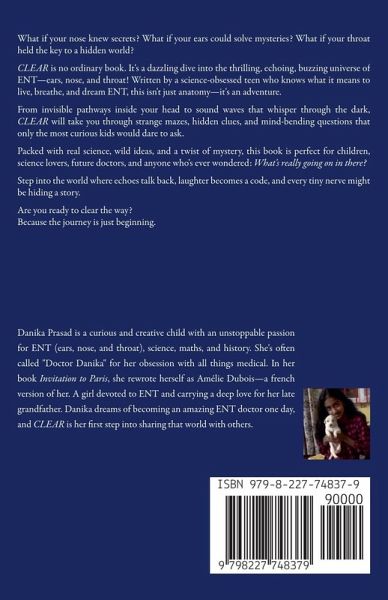 What if your nose knew secrets? What if your ears could solve mysteries? What if your throat held the key to a hidden world? CLEAR is no ordinary book. It's a dazzling dive into the thrilling, echoing, buzzing universe of ENT-ears, nose, and throat! Written by a science-obsessed teen who knows what it means to live, breathe, and dream ENT, this isn't just anatomy-it's an adventure. From invisible pathways inside your head to sound waves that whisper through the dark, CLEAR will take you through strange mazes, hidden clues, and mind-bending questions that only the most curious kids would dare to ask. Packed with real science, wild ideas, and a twist of mystery, this book is perfect for children, science lovers, future doctors, and anyone who's ever wondered: What's really going on in there? Step into the world where echoes talk back, laughter becomes a code, and every tiny nerve might be hiding a story. Are you ready to clear the way? Because the journey is just beginning.