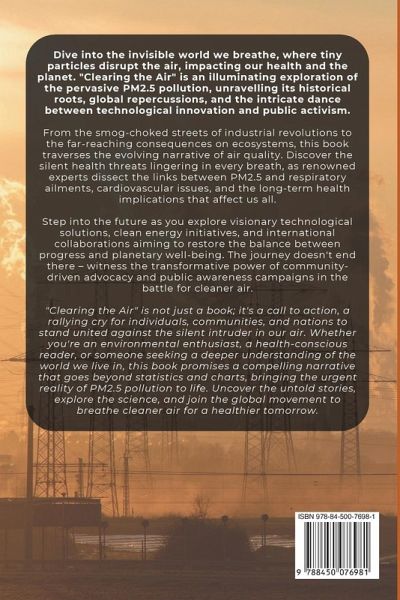 Dive into the invisible world we breathe, where tiny particles disrupt the air, impacting our health and the planet. "Clearing the Air" is an illuminating exploration of the pervasive PM2.5 pollution, unravelling its historical roots, global repercussions, and the intricate dance between technological innovation and public activism. From the smog-choked streets of industrial revolutions to the far-reaching consequences on ecosystems, this book traverses the evolving narrative of air quality. Discover the silent health threats lingering in every breath, as renowned experts dissect the links between PM2.5 and respiratory ailments, cardiovascular issues, and the long-term health implications that affect us all. Step into the future as you explore visionary technological solutions, clean energy initiatives, and international collaborations aiming to restore the balance between progress and planetary well-being. The journey doesn't end there - witness the transformative power of community-driven advocacy and public awareness campaigns in the battle for cleaner air. "Clearing the Air" is not just a book; it's a call to action, a rallying cry for individuals, communities, and nations to stand united against the silent intruder in our air. Whether you're an environmental enthusiast, a health-conscious reader, or someone seeking a deeper understanding of the world we live in, this book promises a compelling narrative that goes beyond statistics and charts, bringing the urgent reality of PM2.5 pollution to life. Uncover the untold stories, explore the science, and join the global movement to breathe cleaner air for a healthier tomorrow.