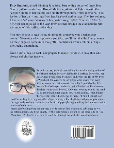 Fran Stewart, award-winning & national best-selling author of three ScotShop mysteries and eleven Biscuit McKee mysteries, delights us with this second volume of her unique take on life through these "mini-memoirs," a collection of her daily musings from her Facebook author page. The first volume, Clear as Mud, covered many of her posts through 2018. Now, with Clearly Me, you can enjoy all of the year 2019, as seen through the eyes and the reminiscences of this well-loved author. You may choose to read it straight through, or maybe you'd rather skip around. No matter which approach you take, you'll find that the Fran you meet on these pages is sometimes thoughtful, sometimes whimsical, but always thoroughly entertaining. Grab a cup of tea, sit back, and prepare to make friends with an author who always delights her readers.