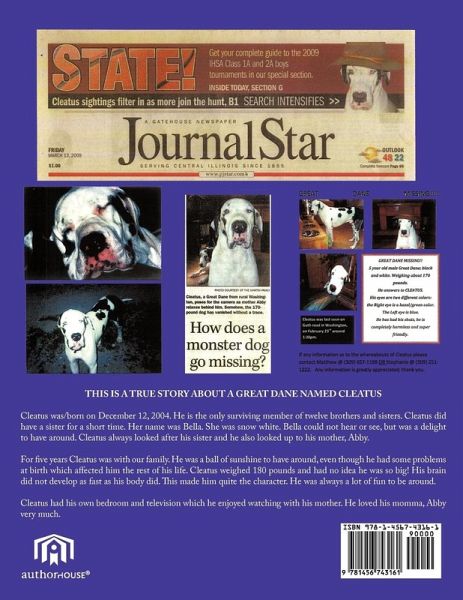 THIS IS A TRUE STORY ABOUT A GREAT DANE NAMED CLEATUS Cleatus was/born on December 12, 2004. He is the only surviving member of twelve brothers and sisters. Cleatus did have a sister for a short time. Her name was Bella. She was snow white. Bella could not hear or see, but was a delight to have around. Cleatus always looked after his sister and he also looked up to his mother, Abby. For five years Cleatus was with our family. He was a ball of sunshine to have around, even though he had some problems at birth which affected him the rest of his life. Cleatus weighed 180 pounds and had no idea he was so big! His brain did not develop as fast as his body did. This made him quite the character. He was always a lot of fun to be around. Cleatus had his own bedroom and television which he enjoyed watching with his mother. He loved his momma, Abby very much.