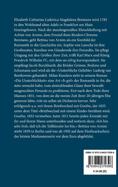 Elisabeth Catharina Ludovica Magdalena Brentano wird 1785 in den Wohlstand alten Adels in Frankfurt am Main hineingeboren. Nach der standesgemäßen Eheschließung mit Achim von Arnim, dem Freund ihres Bruders Clemens Brentano, geht Bettina von Arnim als ein Sinnbild der Romantik in die Geschichte ein. Sophie von Laroche ist ihre Großmutter, Karoline von Günderode ihre Freundin. Sie pflegt Umgang mit den Größen ihrer Zeit, trifft Karl Marx und König Friedrich Wilhelm IV., mit dem sie eifrig korrespondiert. Sie empfängt Jacob Burckhardt, die Brüder Grimm, Brahms und Schumann und wird als die "Unsterbliche Geliebte" Ludwig van Beethovens gehandelt. Milan Kundera sieht in seinem Roman "Die Unsterblichkeit" eine Art "It-girl" der Romantik in ihr, die stets versucht habe, vom abstrahlenden Glanz ihrer bewußt ausgesuchten Freunde zu profitieren. Erst nach dem Tode ihres Mannes 1831, von dem sie die meiste Zeit ihrer 20-jährigen Ehe getrennt lebte, tritt sie selbst als Dichterin hervor. Sehr erfolgreich u.a. mit ihrem Briefwechsel mit Goethe, der 1835 unter dem Titel "Briefwechsel mit einem Kinde" berühmt wird. Goethe, 1832 verstorben, hatte 1811 bereits jeden Kontakt mit ihr und ihrem Mann unterbunden und notierte dazu: "Ich bin sehr froh, daß ich die Tollhäusler los bin." Bettina von Arnim stirbt 1859 in Berlin und war ab 1992 auf dem Fünfmarkschein der letzten Marknotenserievor dem Euro abgebildet.