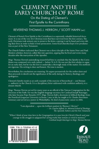 Clement of Rome's First Epistle to the Corinthians, one of the very few Christian texts having survived from the first century, is a supremely valuable historical document. Modern scholars affirm as much, although many have called into question whether Clement was a direct disciple of Sts. Peter and Paul, arguing instead that he lived and wrote many decades after the martyrdom of the apostles. In the groundbreaking Clement and the Early Church of Rome: On the Dating of Clement's First Epistle to the Corinthians, Msgr. Thomas J. Herron presents his rigorously researched conclusions and sketches out the significance of his findings. Clement's Epistle stands as an early example of the exercise of hierarchical-and Roman-authority in the Church. It is a disciplinary letter addressed with confident authority to a distant Church. About the Author Msgr. Thomas J. Herron served for many years as an official of the Vatican Congregation for the Doctrine of the Faith. He was the English-language secretary for Cardinal Joseph Ratzinger, who later became Pope Benedict XVI. Msgr. Herron held a doctorate in biblical theology from the Pontifical Gregorian University in Rome. Later in life, he taught at St. Charles Borromeo Seminary and served as a pastor in Philadelphia. He died of pancreatic cancer in 2004. Endorsements "His methods are rigorous. His writing is clear and unflinchingly honest. His tone is modest. Nevertheless, his conclusions are stunning. He argues very persuasively for the earlier dates; and then he proceeds to sketch out the significance of the early dating for history, theology, and apologetics. Did he succeed? Well, his work has been cited as authoritative by scholars as illustrious as Cardinal Joseph Ratzinger. And His Holiness Pope Benedict XVI is certainly not alone." -Scott Hahn, Bestselling Author and Popular Speaker "I am dependent . . . upon the brilliant analysis by Thomas J. Herron." -Dr. Clayton Jefford, St. Meinrad School of Theology, author of The Apostolic Fathers and the New Testament