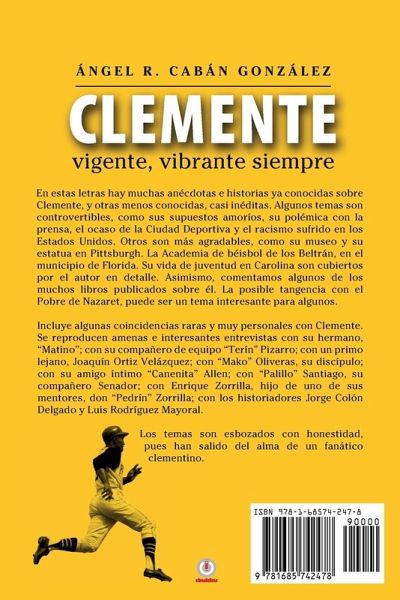 En estas letras hay muchas anécdotas e historias ya conocidas sobre Clemente, y otras menos conocidas, casi inéditas. Algunos temas son controvertibles, como sus supuestos amoríos, su polémica con la prensa, el ocaso de la Ciudad Deportiva y el racismo sufrido en los Estados Unidos. Otros son más agradables, como su museo y su estatua en Pittsburgh. La Academia de béisbol de los Beltrán, en el municipio de Florida. Su vida de juventud en Carolina son cubiertos por el autor en detalle. Asimismo, comentamos algunos de los muchos libros publicados sobre él. La posible tangencia con el Pobre de Nazaret, puede ser un tema interesante para algunos. Incluye algunas coincidencias raras y muy personales con Clemente. Se reproducen amenas e interesantes entrevistas con su hermano, "Matino"; con su compañero de equipo "Terín" Pizarro; con un primo lejano, Joaquín Ortiz Velázquez; con "Mako" Oliveras, su discípulo; con su amigo íntimo "Canenita" Allen; con "Palillo" Santiago, su compañero Senador; con Enrique Zorrilla, hijo de uno de sus mentores, don "Pedrín" Zorrilla; con los historiadores Jorge Colón Delgado y Luis Rodríguez Mayoral.