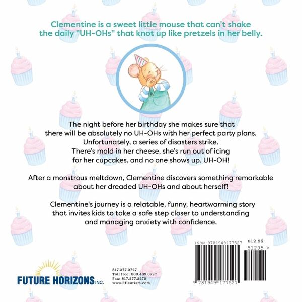 Clementine is a sweet little mouse that can't shake the daily "UH OHs" that knot up like pretzels in her belly. The night before her birthday she makes sure that there will be absolutely no UH OHs with her perfect party plans. Unfortunately, a series of disasters strike. There's mold in her cheese, she's run out of icing for her cupcakes, and no one shows up. UH OH! After a monstrous meltdown, Clementine discovers something remarkable about her dreaded UH-OHs and about herself! In the dynamic world in which we live, anxiety is becoming increasingly more prevalent in our kiddos. The management of anxiety can be challenging for kids and parents alike. The stories of Clementine create a playful environment for kids and parents to explore and face some of the challenges of anxiety with psychological distance. Clementine's journey is a relatable, funny, heartwarming story that invites kids to take a safe step closer to understanding and managing their anxiety with confidence.