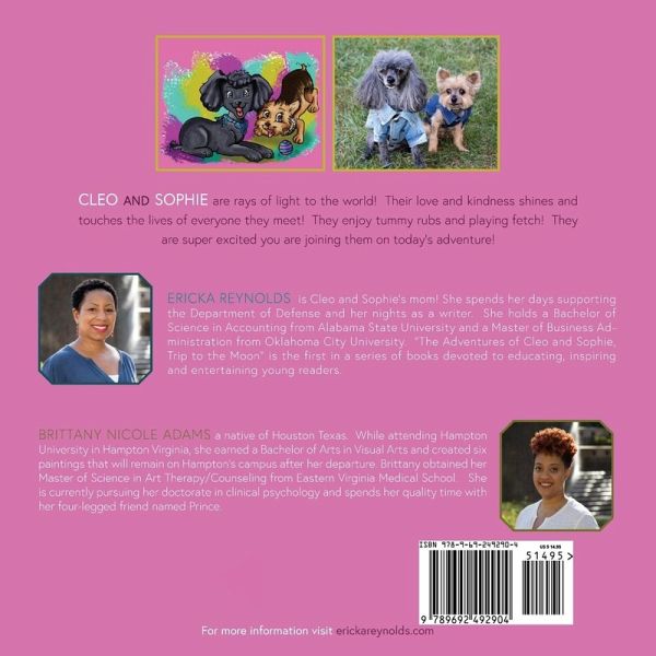 Cleo and Sophie are proud to announce their release of their new book! "The Adventures of Cleo and Sophie: Trip to the Moon" Every day after their family leaves for school and work, Cleo and Sophie dream of someplace fun to explore. Today's journey takes them on a trip to the moon where they learn about astronauts, space and the moon! This book is great for first discovery of space for young readers. This early reader is filled with tons of fun to include activity pages. Children will not only enjoy a fun story but will also have words of inspiration, reading comprehension, creative writing, drawing and coloring pages to keep them entertained! - Dream Big - encourages young readers to do great in school and follow their heart's desire!- Let's Remember - reading comprehension which allows for a fun memory game with space below to for drawing - Continue the Story - creative writing asking the reader to imagine what would happen had they joined Cleo and Sophie on their adventure day and provides space for drawing a picture to go along with their story- Let's Color - includes three coloring pages for children to add their own twist to the illustration in the book.