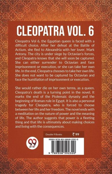 Cleopatra Vol 6, the Egyptian queen is faced with a difficult choice. After her defeat at the Battle of Actium, she fled to Alexandria with her lover, Mark Antony. The city is under siege by Octavian's forces, and Cleopatra knows that she will soon be captured. She can either surrender to Octavian and face imprisonment or execution, or she can take her own life. In the end, Cleopatra chooses to take her own life. She does not want to be captured by Octavian and face the humiliation of imprisonment or execution. She would rather die on her own terms, as a queen. Cleopatra's death is a turning point in the novel. It marks the end of the Ptolemaic dynasty and the beginning of Roman rule in Egypt. It is also a personal tragedy for Cleopatra, who is forced to choose between her life and her freedom. The novel ends with a meditation on the nature of power and the meaning of life. The author suggests that power is a fleeting thing and that life is ultimately about making choices and living with the consequences.
