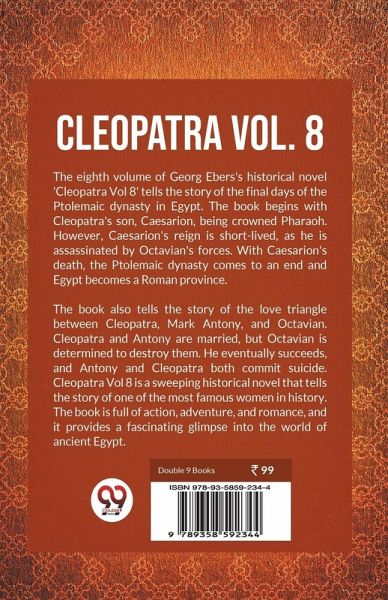 The eighth volume of Georg Ebers's historical novel 'Cleopatra Vol 8' tells the story of the final days of the Ptolemaic dynasty in Egypt. The book begins with Cleopatra's son, Caesarion, being crowned Pharaoh. However, Caesarion's reign is short-lived, as he is assassinated by Octavian's forces. With Caesarion's death, the Ptolemaic dynasty comes to an end and Egypt becomes a Roman province. The book also tells the story of the love triangle between Cleopatra, Mark Antony, and Octavian. Cleopatra and Antony are married, but Octavian is determined to destroy them. He eventually succeeds, and Antony and Cleopatra both commit suicide. Cleopatra Vol 8 is a sweeping historical novel that tells the story of one of the most famous women in history. The book is full of action, adventure, and romance, and it provides a fascinating glimpse into the world of ancient Egypt.