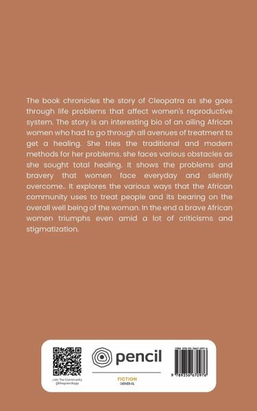 The book chronicles the story of Cleopatra as she goes through life problems that affect women's reproductive system. The story is an interesting bio of an ailing African women who had to go through all avenues of treatment to get a healing. She tries the traditional and modern methods for her problems. she faces various obstacles as she sought total healing. It shows the problems and bravery that women face everyday and silently overcome.. It explores the various ways that the African community uses to treat people and its bearing on the overall well being of the woman. In the end a brave African women triumphs even amid a lot of criticisms and stigmatization.