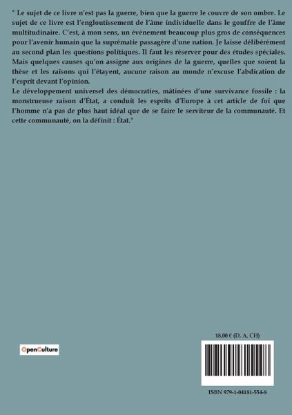 " Le sujet de ce livre n¿est pas la guerre, bien que la guerre le couvre de son ombre. Le sujet de ce livre est l¿engloutissement de l¿âme individuelle dans le gouffre de l¿âme multitudinaire. C¿est, à mon sens, un événement beaucoup plus gros de conséquences pour l¿avenir humain que la suprématie passagère d¿une nation. Je laisse délibérément au second plan les questions politiques. Il faut les réserver pour des études spéciales. Mais quelques causes qüon assigne aux origines de la guerre, quelles que soient la thèse et les raisons qui l¿étayent, aucune raison au monde n¿excuse l¿abdication de l¿esprit devant l¿opinion. Le développement universel des démocraties, mâtinées d¿une survivance fossile : la monstrueuse raison d¿État, a conduit les esprits d¿Europe à cet article de foi que l¿homme n¿a pas de plus haut idéal que de se faire le serviteur de la communauté. Et cette communauté, on la définit : État."