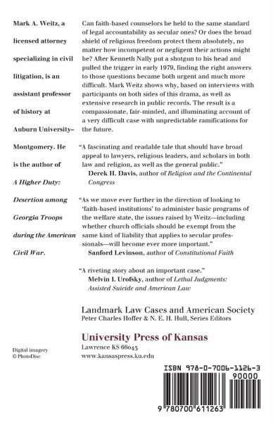 Can faith-based counselors be held to the same standard of legal accountability as secular ones? Or does the broad shield of religious freedom protect them absolutely, no matter how incompetent or negligent their actions might be? After Kenneth Nally put a shotgun to his head and pulled the trigger in early 1979, finding the right answers to those questions became both much more urgent and much more difficult. Mark Weitz shows why. Following his suicide, Nally's parents filed a wrongful death suit against their son's fundamentalist church, alleging that its pastoral counselors had failed to steer him toward the professional help they thought he needed and even dissuaded him from seeking secular help. The resulting legal case lasted nearly a decade, alarmed church leaders of every faith, and transformed judicial thought in this highly sensitive area of American life. Nally v. Grace Community Church of the Valley was the nation's first case to allege "clergy malpractice," one that challenged the freedom of religious leaders to counsel their parishioners. Initially dismissed on religious freedom grounds, the parents' suit was twice reinstated by an appeals court, only to be overturned by a unanimous vote by the California State Supreme Court in 1988. But that decision was made on very narrow grounds, leaving open the likelihood of future court challenges. As told by Weitz, the Nally case is as much a story of modern America as it is an account of courtroom proceedings. By examining both the rise of the fundamentalist movement in the Los Angeles area in the 1960s and 1970s and the social pressures with which Kenneth Nally struggled, he reveals how a culture based on personal achievement came into direct conflict with one based on the search for salvation. He also shows the difficulty of deciding a case in which the competing claims-religious freedom and professional accountability-both rest on key principles revered in American society. Based on interviews with participants on both sides of this drama, as well as extensive research in public records, Weitz provides a compassionate, fair-minded, and illuminating account of a very difficult case with unpredictable ramifications for the future.