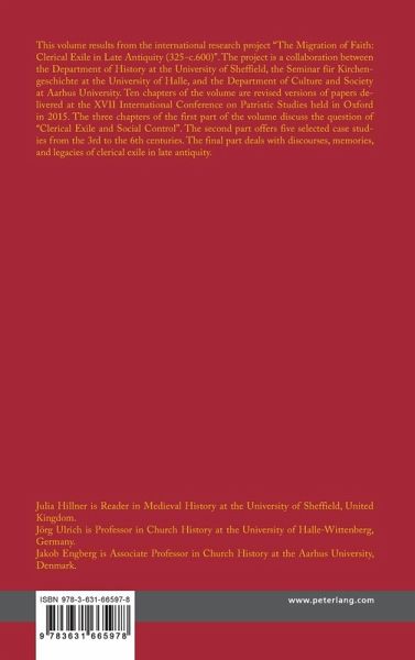 This volume results from the international research project 'The Migration of Faith: Clerical Exile in Late Antiquity (325-c.600)'. The project is a collaboration between the Department of History at the University of Sheffield, the Seminar für Kirchengeschichte at the University of Halle, and the Department of Culture and Society at Aarhus University. Ten chapters of the volume are revised versions of papers delivered at the XVII International Conference on Patristic Studies held in Oxford in 2015. The three chapters of the first part of the volume discuss the question of "Clerical Exile and Social Control". The second part offers five selected case studies from the 3rd to the 6th centuries. The final part deals with discourses, memories, and legacies of clerical exile in late antiquity.