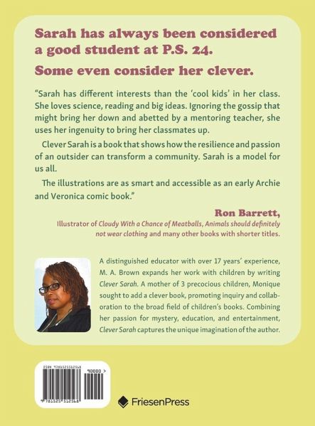 Sarah has always been considered a good student at P.S. 24. Some even consider her clever. "Sarah has different interests than the 'cool kids' in her class. She loves science, reading and big ideas. Ignoring the gossip that might bring her down and abetted by a mentoring teacher, she uses her ingenuity to bring her classmates up. Clever Sarah is a book that shows how the resilience and passion of an outsider can transform a community. Sarah is a model for us all. The illustrations are as smart and accessible as an early Archie and Veronica comic book." - Ron Barrett, illustrator of Cloudy With a Chance of Meatballs, Animals should definitely not wear clothing and many other books with shorter titles.