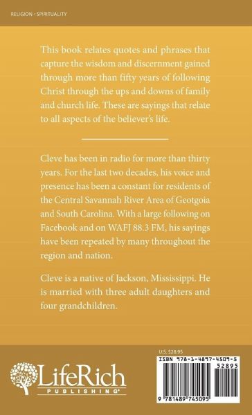 This book relates quotes and phrases that capture the wisdom and discernment gained through more than fifty years of following Christ through the ups and downs of family and church life. These are sayings that relate to all aspects of the believer's life.