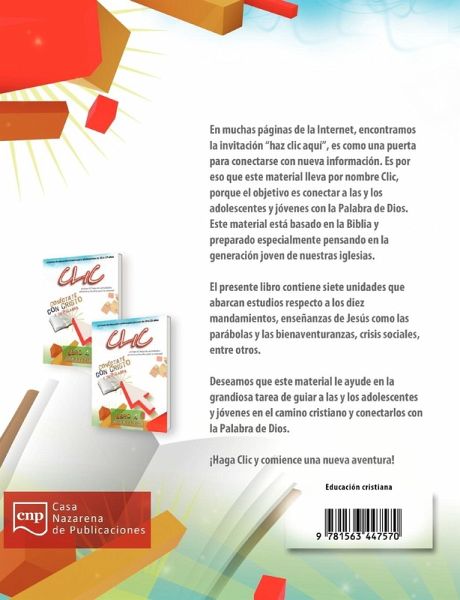 Nos sentimos desafiados al saber que personas como usted han adquirido este libro. La tarea de educar a las y los adolescentes y jóvenes no es fácil y debemos ser muy cuidadosos al buscar el material para hacerlo. Le ayudará saber que el presente material está basado en enseñanzas bíblicas y ha sido preparado por un equipo internacional de personas capacitadas en diferentes disciplinas pero con el común denominador de conocer y amar a los adolescentes y jóvenes de sus iglesias. Las 52 lecciones se han dividido en siete unidades temáticas. No todas las unidades tienen el mismo número de lecciones, pues varían de acuerdo a los temas tratados. Considerando las características y necesidades de las etapas de la adolescencia y la juventud, este libro se ha diseñado para dos grupos de edades: De 12 a 17 años y de 18 a 23 años. Usted tiene la libertad de adaptarlo de acuerdo a las necesidades de su clase de escuela dominical o grupo de estudio bíblico en su iglesia local. El libro contiene el desarrollo de las lecciones y en cada una de ellas encontrará las siguientes secciones: ¿ El Objetivo, que indica lo que se desea lograr en el alumno. ¿ La sección Conéctate, corresponde a la introducción de la lección y se sugieren actividades introductorias a los temas planteados. ¿ ¡A navegar! es la sección donde se desarrolla la lección en sí. ¿ La sección Descargas incluye el desarrollo de las actividades prácticas que sus alumnas y alumnos realizarán en su hoja de trabajo. El anhelo es que las alumnas y los alumnos mediante el desarrollo de estas actividades fijen en su mente y corazón los principios fundamentales del tema. ¿ Finalmente, Advertencia, es un aviso que aparece al inicio y al final de cada lección. La del inicio le ayudará a recordar que debe comenzar la clase recordando lo que se trató la semana anterior. El seguimiento es básico para el cumplimiento de la unidad. La ventana de Advertencia del final le recordará trabajar con la sección ¡Vamos al chat! que aparece en las hojas de trabajo para los alumnos. Junto a este libro para el maestro, hemos desarrollado dos libros para alumnos, los cuales son apropiados a su edad, uno para los alumnos de 12 a 17 y otro para los alumnos de 18 a 23 años. En estos libros, se incluyen las 52 Hojas de trabajo correspondientes a cada lección, donde usted encontrará las siguientes secciones: ¿ Conéctate. Una parte importante para crecer en nuestra vida cristiana es la memorización de textos bíblicos. En especial en la edad que tienen sus alumnas y alumnos. Por ello se sugiere animarles a memorizar el texto de cada lección. En la página 7 hay algunas ayudas para que la memorización de textos sea amena. ¿ Descargas. Son las actividades prácticas que sus alumnos y alumnas desarrollarán al final o durante la lección, incluye, cuestionarios, crucigramas, sopa de letras, entre otras. Usted puede fotocopiar las hojas de trabajo de acuerdo a la cantidad de personas en su grupo. ¿ ¡Vamos al Chat! Es el reto o desafío personal que sus alumnos y alumnas deberán cumplir durante la semana. El objetivo es animarles a poner en práctica lo aprendido en la clase y tomar decisiones firmes en su propia vida. ¿ Sabías que... Se refiere a datos relevantes y curiosos respecto al tema que se estudió en clase. Es nuestro deseo que este material sea de mucha ayuda para su ministerio con las y los adolescentes y jóvenes de su iglesia local; que usted pueda guiarlos en el aprendizaje acerca de las enseñanzas de Jesús, ejemplo de personajes bíblicos, los diez mandamientos, entre otros temas. Finalmente queremos pedirle que por favor llene la hoja de encuesta que aparece al final del libro y nos la haga llegar. Sus apreciaciones nos ayudarán a ser más efectivos en la preparación de futuros materiales y en la tarea de ¡conectar a esta generación con la Palabra de Dios!