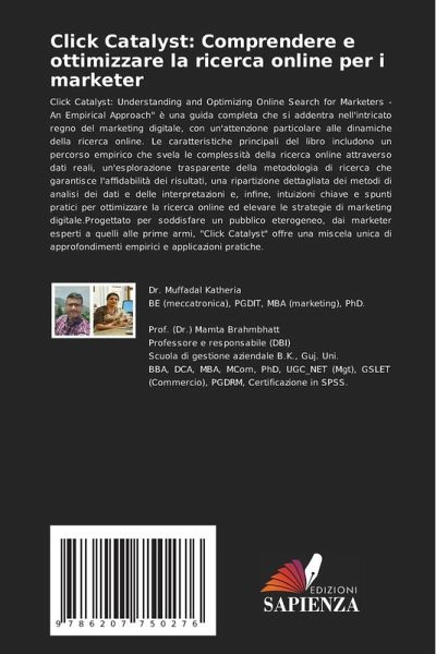 Click Catalyst: Understanding and Optimizing Online Search for Marketers - An Empirical Approach" è una guida completa che si addentra nell'intricato regno del marketing digitale, con un'attenzione particolare alle dinamiche della ricerca online. Le caratteristiche principali del libro includono un percorso empirico che svela le complessità della ricerca online attraverso dati reali, un'esplorazione trasparente della metodologia di ricerca che garantisce l'affidabilità dei risultati, una ripartizione dettagliata dei metodi di analisi dei dati e delle interpretazioni e, infine, intuizioni chiave e spunti pratici per ottimizzare la ricerca online ed elevare le strategie di marketing digitale.Progettato per soddisfare un pubblico eterogeneo, dai marketer esperti a quelli alle prime armi, "Click Catalyst" offre una miscela unica di approfondimenti empirici e applicazioni pratiche.