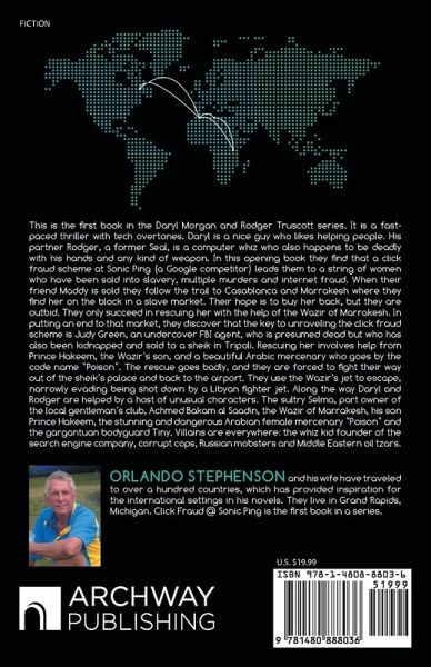 This is the first book in the Daryl Morgan and Rodger Truscott series. It is a fast-paced thriller with tech overtones. Daryl is a nice guy who likes helping people. His partner Rodger, a former Seal, is a computer whiz who also happens to be deadly with his hands and any kind of weapon. In this opening book they find that a click fraud scheme at Sonic Ping (a Google competitor) leads them to a string of women who have been sold into slavery, multiple murders and internet fraud. When their friend Maddy is sold they follow the trail to Casablanca and Marrakesh where they find her on the block in a slave market. Their hope is to buy her back, but they are outbid. They only succeed in rescuing her with the help of the Wazir of Marrakesh. In putting an end to that market, they discover that the key to unraveling the click fraud scheme is Judy Green, an undercover FBI agent, who is presumed dead but who has also been kidnapped and sold to a sheik in Tripoli. Rescuing her involves help from Prince Hakeem, the Wazir's son, and a beautiful Arabic mercenary who goes by the code name "Poison". The rescue goes badly, and they are forced to fight their way out of the sheik's palace and back to the airport. They use the Wazir's jet to escape, narrowly evading being shot down by a Libyan fighter jet. Along the way Daryl and Rodger are helped by a host of unusual characters. The sultry Selma, part owner of the local gentleman's club, Achmed Bakam al Saadin, the Wazir of Marrakesh, his son Prince Hakeem, the stunning and dangerous Arabian female mercenary "Poison" and the gargantuan bodyguard Tiny. Villains are everywhere: the whiz kid founder of the search engine company, corrupt cops, Russian mobsters and Middle Eastern oil tzars.