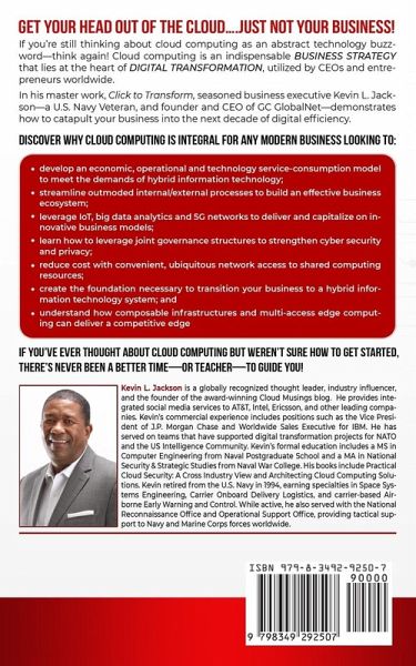 GET YOUR HEAD OUT OF THE CLOUD... JUST NOT YOUR BUSINESS! If you're still thinking about cloud computing as an abstract technology buzzword-think again! Cloud computing is an indispensable BUSINESS STRATEGY that lies at the heart of DIGITAL TRANSFORMATION, utilized by CEOs and entrepreneurs worldwide. In his master work, Click to Transform, seasoned business executive Kevin L. Jackson-a U.S. Navy Veteran, and founder and CEO of GC GlobalNet-demonstrates how to catapult your business into the next decade of digital efficiency. Discover why cloud computing is integral for any modern business looking to: ¿ develop an economic, operational and technology service-consumption model to meet the demands of hybrid information technology; ¿ Streamline outmoded internal/external processes to build an effective business ecosystem; ¿ Leverage IoT, big data analytics and 5G networks to deliver and capitalize on innovative business models; ¿ Learn how to leverage joint governance structures to strengthen cyber security and privacy; ¿ Reduce cost with convenient, ubiquitous network access to shared computing resources; ¿ Create the foundation necessary to transition your business to a hybrid information technology system; and... ¿ Understand how composable infrastructures and multi-access edge computing can deliver a competitive edge. If you've ever thought about cloud computing but weren't sure how to get started, there's never been a better time-or teacher-to guide you! Transform your life by transforming your business! Get your copy of Click to Transform today!