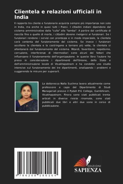 Il rapporto tra cliente e funzionario acquista sempre più importanza non solo in India, ma anche in quasi tutti i Paesi. I cittadini indiani dipendono dal sistema amministrativo dalla "culla" alla "tomba". A partire dal certificato di nascita fino a quello di morte, i cittadini devono rivolgersi ai funzionari. Se i funzionari rendono i servizi con prontezza e in modo imparziale, la clientela sarà contenta del funzionamento del sistema. Se invece i funzionari assillano la clientela e la costringono a tornare più volte, la clientela si allontanerà dal funzionamento del sistema. Ritardi, favoritismi, nepotismo, corruzione, interferenze di intermediari sono alcuni dei fattori che influenzano il funzionamento dell'organizzazione. In questo libro l'autore ha preso in considerazione i dipartimenti dell'Unione, dello Stato e dell'amministrazione locale di Visakhapatnam e ha condotto uno studio intensivo sul funzionamento dei tre dipartimenti, analizzando i problemi e suggerendo le misure per superarli.