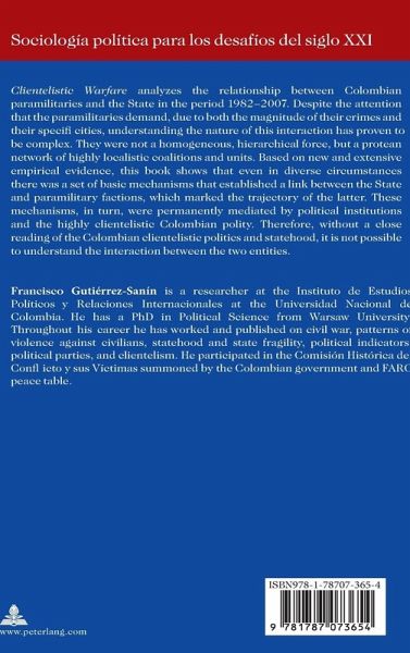 Clientelistic Warfare analyzes the relationship between Colombian paramilitaries and the State in the period 1982-2007. Despite the attention that the paramilitaries demand, due to both the magnitude of their crimes and their specifi cities, understanding the nature of this interaction has proven to be complex. They were not a homogeneous, hierarchical force, but a protean network of highly localistic coalitions and units. Based on new and extensive empirical evidence, this book shows that even in diverse circumstances there was a set of basic mechanisms that established a link between the State and paramilitary factions, which marked the trajectory of the latter. These mechanisms, in turn, were permanently mediated by political institutions and the highly clientelistic Colombian polity. Therefore, without a close reading of the Colombian clientelistic politics and statehood, it is not possible to understand the interaction between the two entities.