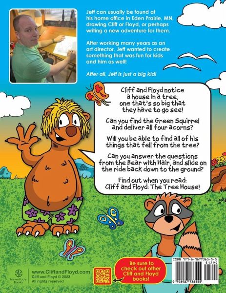Cliff and Floyd - The Tree House Cliff and Floyd notice a house in a tree,one that's so big that they have to go see! Can you find the Green Squirrel and deliver all four acorns? Will you be able to find all of his things that fell from the tree? Can you answer the questionsfrom the Bear with Hair, and slide on the ride back down to the ground? Find out when you read:The Tree House! Cliff and Floyd are counting on you!Just make sure to pay attention throughout the book! Cliff and Floyd books are fun, interactive, colorful books that pose questions about the adventure that will help Cliff and Floyd get out of whatever predicament that they find themselves in! The Tree House also includes a two page 'hidden objects' picture spread, where the reader has to find the missing objects, as well as a maze where the reader will need to find all four acorns and deliver them to the Green Squirrel at the top of the tree! Ages: 5 - 10Younger kids would love looking at the illustrations and have it read to them!Be sure to check out other Cliff and Floyd adventure books!