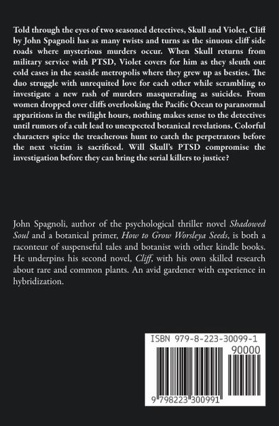 Told through the eyes of two seasoned detectives, Skull and Violet, Cliff by John Spagnoli has as many twists and turns as the sinuous cliff side roads where mysterious murders occur. When Skull returns from military service with PTSD, Violet covers for him as they sleuth out cold cases in the seaside metropolis where they grew up as besties. The duo struggle with unrequited love for each other while scrambling to investigate a new rash of murders masquerading as suicides. From women dropped over cliffs overlooking the Pacific Ocean to paranormal apparitions in the twilight hours, nothing makes sense to the detectives until rumors of a cult lead to unexpected botanical revelations. Colorful characters spice the treacherous hunt to catch the perpetrators before the next victim is sacrificed. Will Skull's PTSD compromise the investigation before they can bring the serial killers to justice?