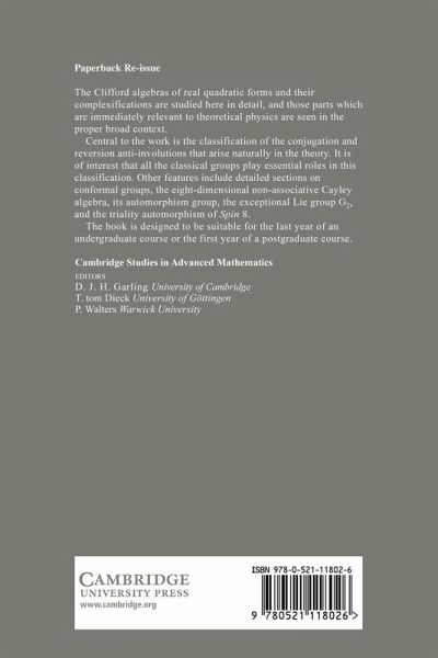 The Clifford algebras of real quadratic forms and their complexifications are studied here in detail, and those parts which are immediately relevant to theoretical physics are seen in the proper broad context. Central to the work is the classification of the conjugation and reversion anti-involutions that arise naturally in the theory. It is of interest that all the classical groups play essential roles in this classification. Other features include detailed sections on conformal groups, the eight-dimensional non-associative Cayley algebra, its automorphism group, the exceptional Lie group G2, and the triality automorphism of Spin 8. The book is designed to be suitable for the last year of an undergraduate course or the first year of a postgraduate course.
