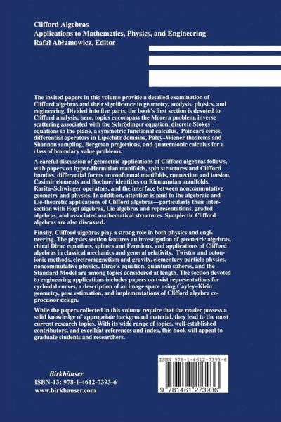 I. Clifford Analysis.- 1. The Morera Problem in Clifford Algebras and the Heisenberg Group.- 2. Multidimensional Inverse Scattering Associated with the Schrödinger Equation.- 3. On Discrete Stokes and Navier-Stokes Equations in the Plane.- 4. A Symmetric Functional Calculus for Systems of Operators of Type ?.- 5. Poincaré Series in Clifford Analysis.- 6. Harmonic Analysis for General First Order Differential Operators in Lipschitz Domains.- 7. Paley-Wiener Theorems and Shannon Sampling in the Clifford Analysis Setting.- 8. Bergman Projection in Clifford Analysis.- 9. Quaternionic Calculus for a Class of Initial Boundary Value Problems.- II. Geometry.- 10. A Nahm Transform for Instantons over ALE Spaces.- 11. Hyper-Hermitian Manifolds and Connections with Skew-Symmetric Torsion.- 12. Casimir Elements and Bochner Identities on Riemannian Manifolds.- 13. Eigenvalues of Dirac and Rarita-Schwinger Operators.- 14. Differential Forms Canonically Associated to Even-Dimensional Compact Conformal Manifolds.- 15. The Interface of Noncommutative Geometry and Physics.- III. Mathematical Structures.- 16. The Method of Virtual Variables and Representations of Lie Superalgebras.- 17. Algebras Like Clifford Algebras.- 18. Grade Free Product Formulæ from Grassmann-Hopf Gebras.- 19. The Clifford Algebra in the Theory of Algebras, Quadratic Forms, and Classical Groups.- 20. Lipschitz's Methods of 1886 Applied to Symplectic Clifford Algebras.- 21. The Group of Classes of Involutions of Graded Central Simple Algebras.- 22. A Binary Index Notation for Clifford Algebras.- 23. Transposition in Clifford Algebra: SU(3) from Reorientation Invariance.- IV. Physics.- 24. The Quantum/Classical Interface: Insights from Clifford's (Geometric) Algebra.- 25. Standard Quantum Spheres.- 26.Clifford Algebras, Pure Spinors and the Physics of Fermions.- 27. Spinor Formulations for Gravitational Energy-Momentum.- 28. Chiral Dirac Equations.- 29. Using Octonions to Describe Fundamental Particles.- 30. Applications of Geometric Algebra in Electromagnetism, Quantum Theory and Gravity.- 31. Noncommutative Physics on Lie Algebras, (?2)n Lattices and Clifford Algebras.- 32. Dirac Operator on Quantum Homogeneous Spaces and Noncommutative Geometry.- 33. r-Fold Multivectors and Superenergy.- 34. The Cl7 Approach to the Standard Model.- V. Applications in Engineering.- 35. Implementation of a Clifford Algebra Co-Processor Design on a Field Programmable Gate Array.- 36. Image Space.- 37. Pose Estimation of Cycloidal Curves by using Twist Representations.