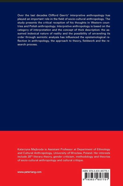 Over the last decades Clifford Geertz' interpretive anthropology has played an important role in the field of socio-cultural anthropology. The study presents the critical reception of his thoughts in Western countries and Polish anthropology. Interpretive anthropology is based on the category of interpretation and the concept of thick description: the assumed indexical nature of reality and the possibility of unraveling its order through semiotic analysis has influenced the epistemological reflection in anthropology, the approach to theory, fieldwork and the research process.