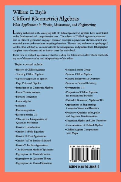 This volume is an outgrowth of the 1995 Summer School on Theoretical Physics of the Canadian Association of Physicists (CAP), held in Banff, Alberta, in the Canadian Rockies, from July 30 to August 12,1995. The chapters, based on lectures given at the School, are designed to be tutorial in nature, and many include exercises to assist the learning process. Most lecturers gave three or four fifty-minute lectures aimed at relative novices in the field. More emphasis is therefore placed on pedagogy and establishing comprehension than on erudition and superior scholarship. Of course, new and exciting results are presented in applications of Clifford algebras, but in a coherent and user-friendly way to the nonspecialist. The subject area of the volume is Clifford algebra and its applications. Through the geometric language of the Clifford-algebra approach, many concepts in physics are clarified, united, and extended in new and sometimes surprising directions. In particular, the approach eliminates the formal gaps that traditionally separate clas sical, quantum, and relativistic physics. It thereby makes the study of physics more efficient and the research more penetrating, and it suggests resolutions to a major physics problem of the twentieth century, namely how to unite quantum theory and gravity. The term "geometric algebra" was used by Clifford himself, and David Hestenes has suggested its use in order to emphasize its wide applicability, and b& cause the developments by Clifford were themselves based heavily on previous work by Grassmann, Hamilton, Rodrigues, Gauss, and others.