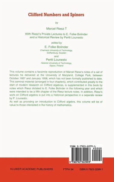 Marcellliesz's lectures delivered on October 1957 -January 1958 at the Uni versity of Maryland, College Park, have been previously published only infor mally as a manuscript entitled CLIFFORD NUMBERS AND SPINORS (Chap ters I - IV). As the title says, the lecture notes consist of four Chapters I, II, III and IV. However, in the preface of the lecture notes lliesz refers to Chapters V and VI which he could not finish. Chapter VI is mentioned on pages 1, 3, 16, 38 and 156, which makes it plausible that lliesz was well aware of what he was going to include in the final missing chapters. The present book makes lliesz's classic lecture notes generally available to a wider audience and tries somewhat to fill in one of the last missing chapters. This book also tries to evaluate lliesz's influence on the present research on Clifford algebras and draws special attention to lliesz's contributions in this field - often misunderstood.