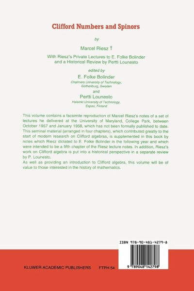 Marcellliesz's lectures delivered on October 1957 -January 1958 at the Uni versity of Maryland, College Park, have been previously published only infor mally as a manuscript entitled CLIFFORD NUMBERS AND SPINORS (Chap ters I - IV). As the title says, the lecture notes consist of four Chapters I, II, III and IV. However, in the preface of the lecture notes lliesz refers to Chapters V and VI which he could not finish. Chapter VI is mentioned on pages 1, 3, 16, 38 and 156, which makes it plausible that lliesz was well aware of what he was going to include in the final missing chapters. The present book makes lliesz's classic lecture notes generally available to a wider audience and tries somewhat to fill in one of the last missing chapters. This book also tries to evaluate lliesz's influence on the present research on Clifford algebras and draws special attention to lliesz's contributions in this field - often misunderstood.