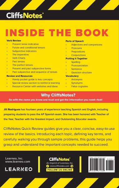 Get the information you need-fast! CliffsNotes Quick Review course guides cover the essentials of your toughest classes. Get a firm grip on core concepts and key material, and test your newfound knowledge with review questions. Introducing each topic, defining key terms, and carefully walking you through each sample problem, these guides help you grasp and understand the important concepts needed to succeed. The essentials - FAST - from the experts at CliffsNotes Complete coverage of core concepts Easy topic-by-topic organization Access hundreds of practice problems at www.cliffsnotes.com CliffsNotes Spanish II: Quick Review continues where CliffsNotes Spanish I: Quick Review left off and is meant to provide all the foundations of basic Spanish pronunciation, spelling, and sentence construction. Spanish grammar is systematically explained in its most simplistic way; if you've already read CliffsNotes Spanish I: Quick Review or if you already have a good foundation in Spanish, this book is an appropriate resource to hone your skills to the equivalent of two years of college-level Spanish. In no time, you'll be ready to tackle the key concepts, such as: New verb tenses - future tense, conditional tense, compound tenses, and the past participle Subjunctive Mood I and II Prepositions and pronouns Passive voice, conjunctions, and more sentence variations Past subjunctive and sequence of tenses Antonyms and synonyms With Review Questions, a Resource Center, and a Glossary. Why CliffsNotes? In plain words and useful formats, CliffsNotes Spanish II: Quick Review provides an overview of Spanish language fundamentals, so that you can use your study time efficiently. Use this reference in any way that fits your personal style for study and review-you decide what works best with your needs. Or, here are just a few other ways you can search for topics: Use the free Pocket Guide full of essential information Get a glimpse of what you'll gain from a chapter by reading through the Chapter Check-In at the beginning of each chapter Use the Chapter Checkout at the end of each chapter to gauge your grasp of the important information you need to know Test your knowledge more completely in the CQR Review and look for additional sources of information in the CQR Resource Center Use the glossary to find key terms fast With titles available for all the most popular high school and college courses, CliffsNotes Quick Review guides are a comprehensive resource that can help you get the best possible grades. Access 500 additional practice questions at www.cliffsnotes.com. From CliffsNotes, the makers of the study guides you trust, year after year!
